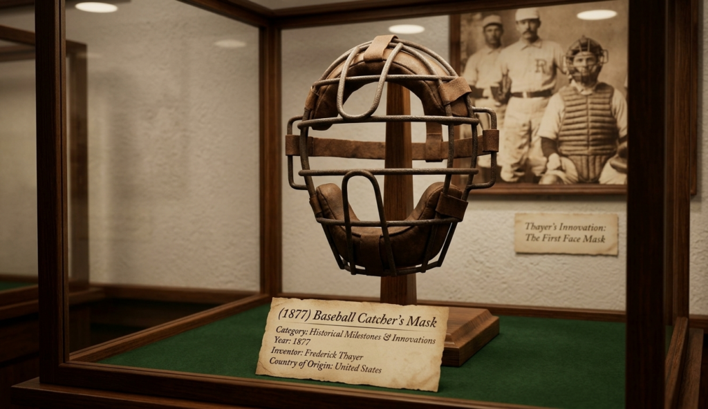 The baseball catcher’s mask was introduced in 1877 by Harvard catcher Frederick Thayer. Before its invention, catchers played without facial protection and were frequently injured by foul tips and fast pitches. The mask used a metal wire frame with padding to shield the face while allowing visibility.
