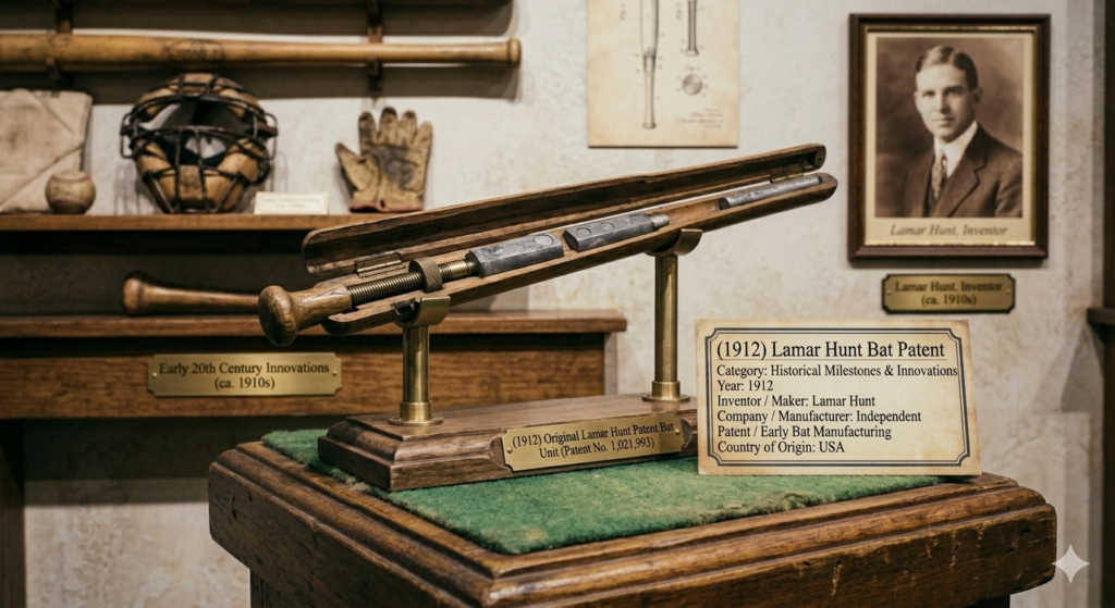 The Lamar Hunt Bat Patent (1912) represents an early effort to improve the design and construction of baseball bats through patented innovation. The patent introduced ideas for enhanced durability, balance, and performance, contributing to the evolution of bat manufacturing during the early 20th century.