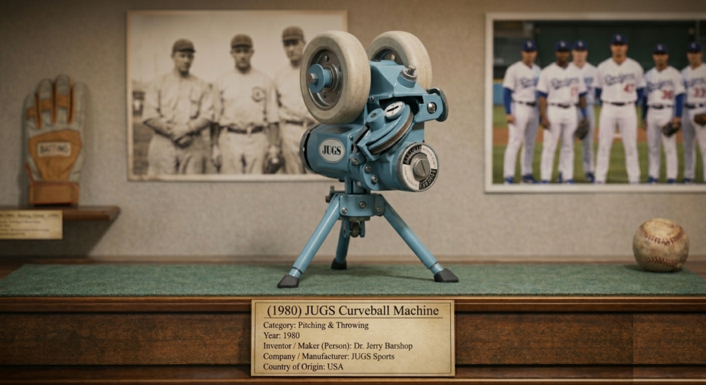 The JUGS Curveball Machine is an advanced pitching machine capable of simulating breaking pitches, including curveballs and sliders. Introduced in 1980, it allowed players to practice hitting more complex pitches without relying on a live pitcher.