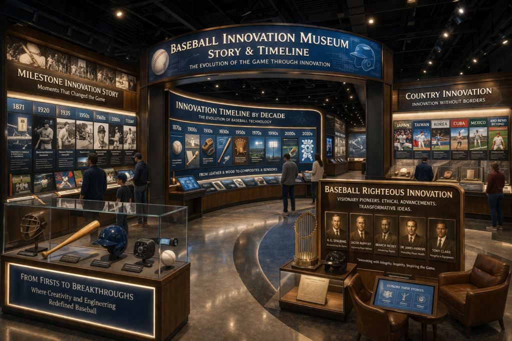 - Milestone Innovation Story — The moments that changed the game. From the first batting helmet to biomechanical analysis, this exhibit highlights the key breakthroughs where creativity and engineering converged to redefine baseball.